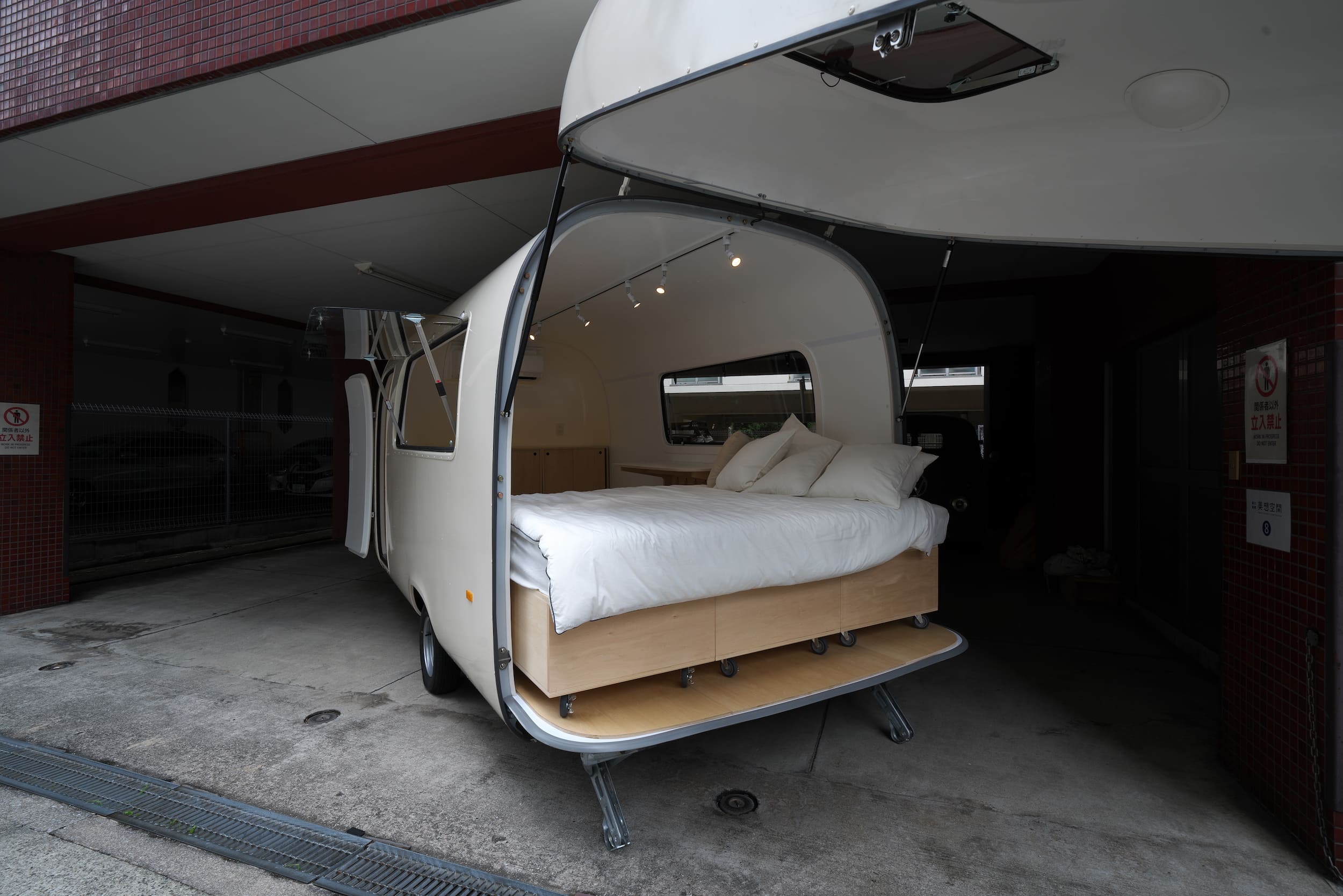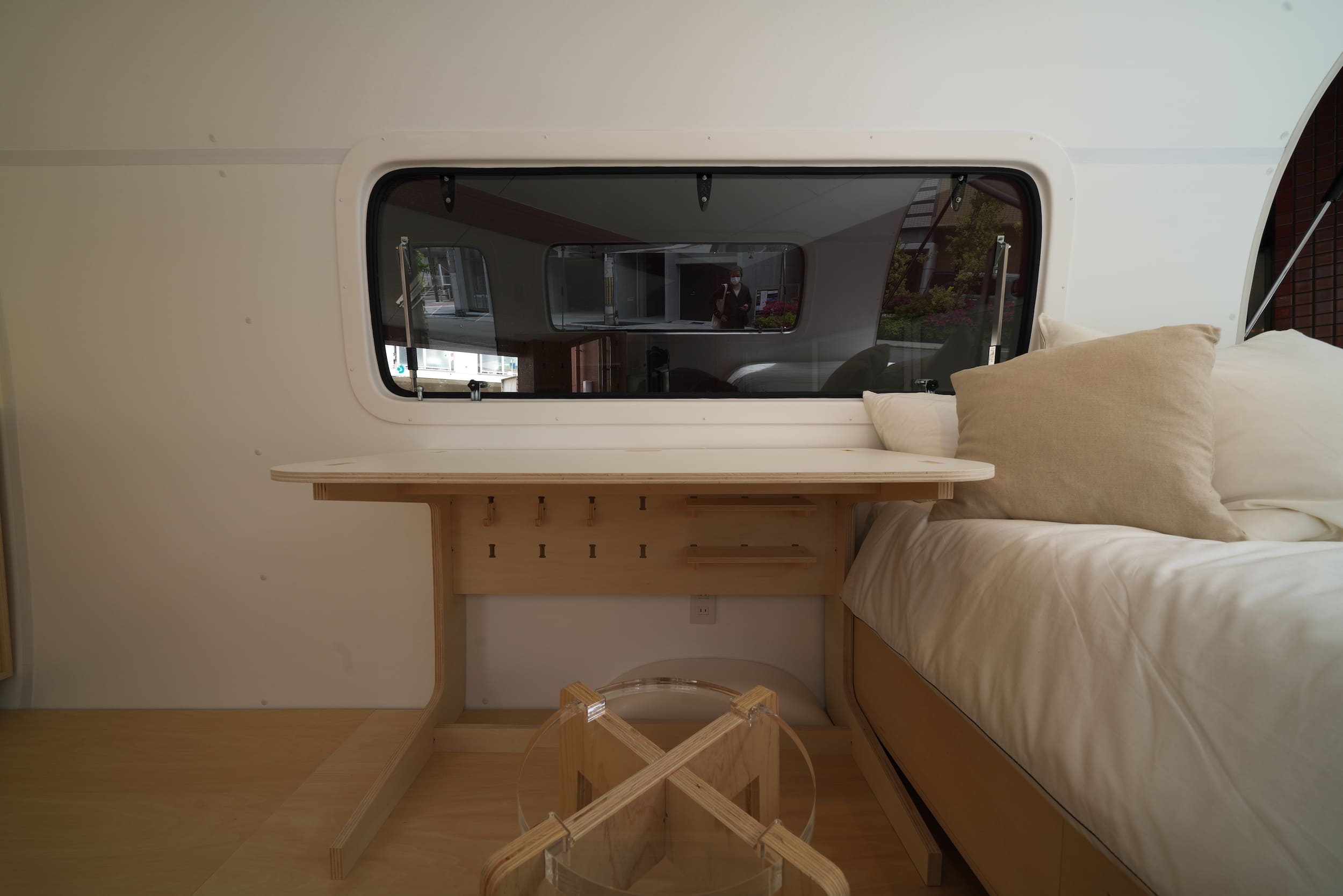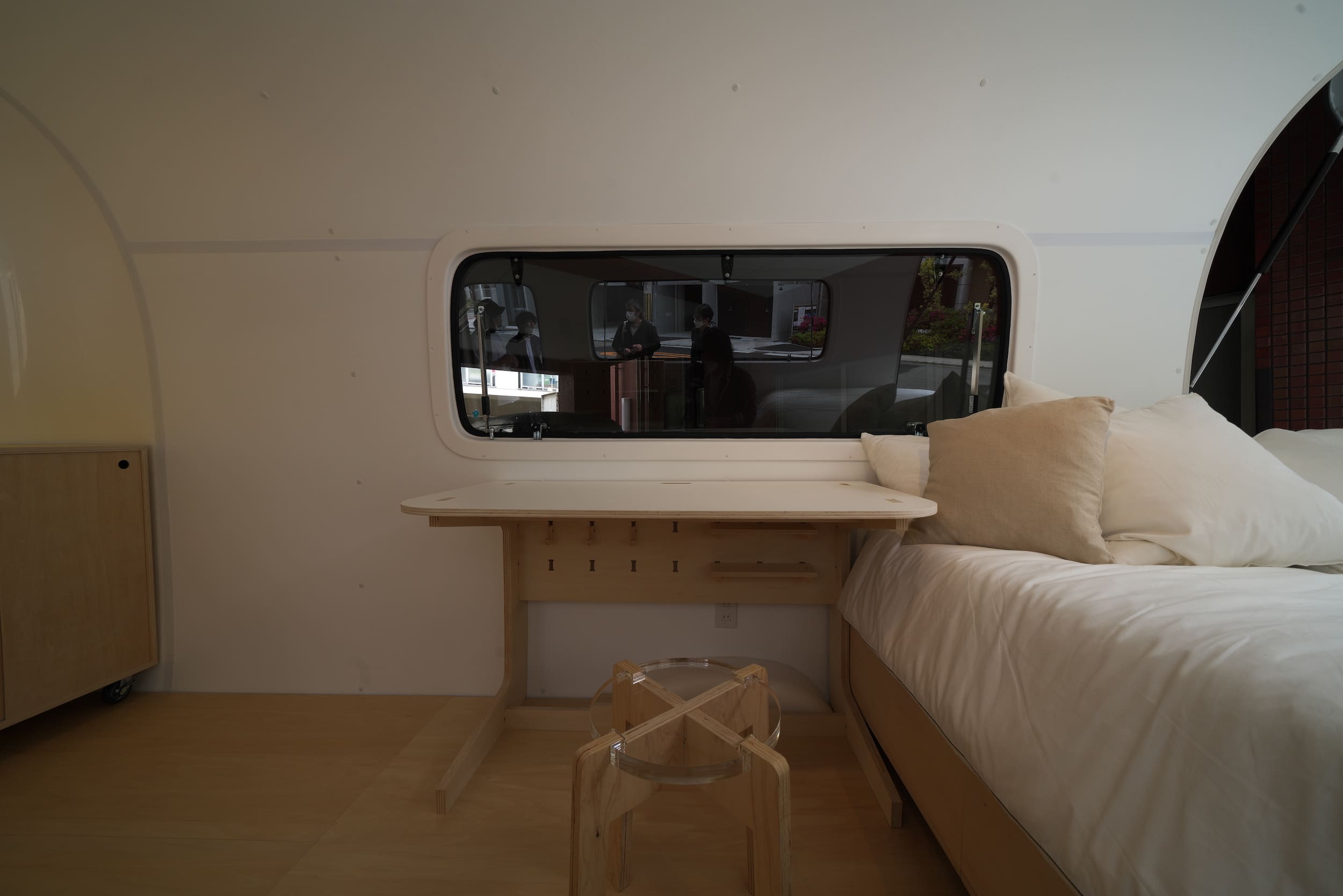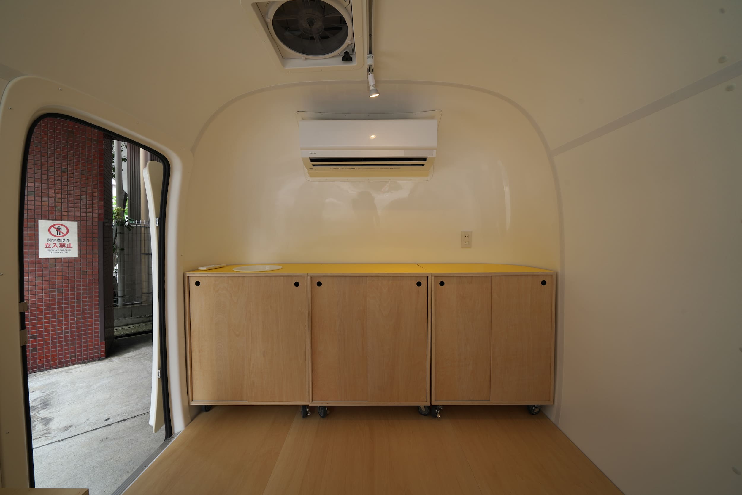 このトレーラーのもつ雰囲気を活かしながら、さわやかさのあるシンプルかつ可愛らしい家具を仕立てました。